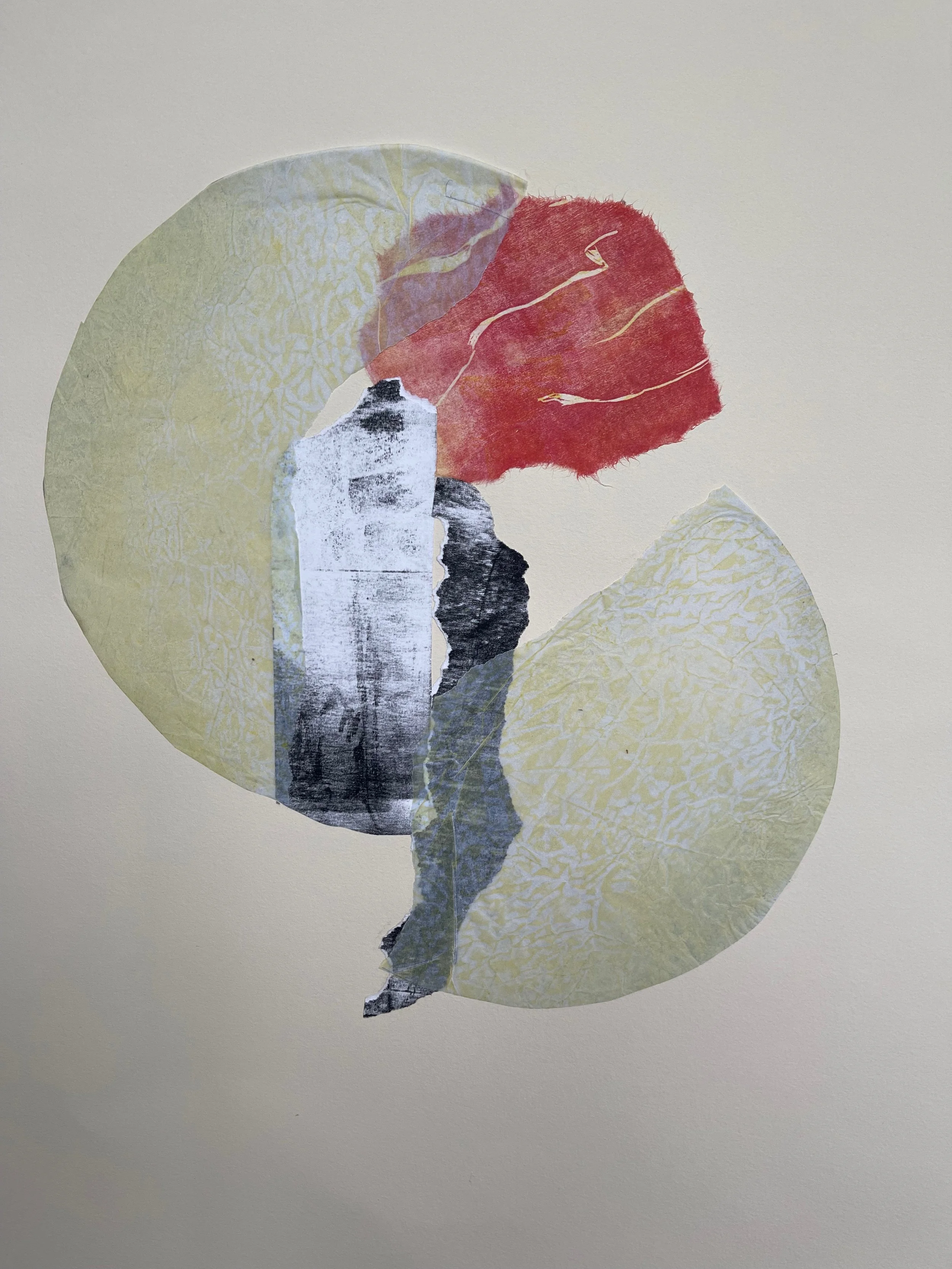 Fractured Sphere is a collage combining wood lithography, monotype and woodcut. It was completed in 2025. It is 16” X 20”.