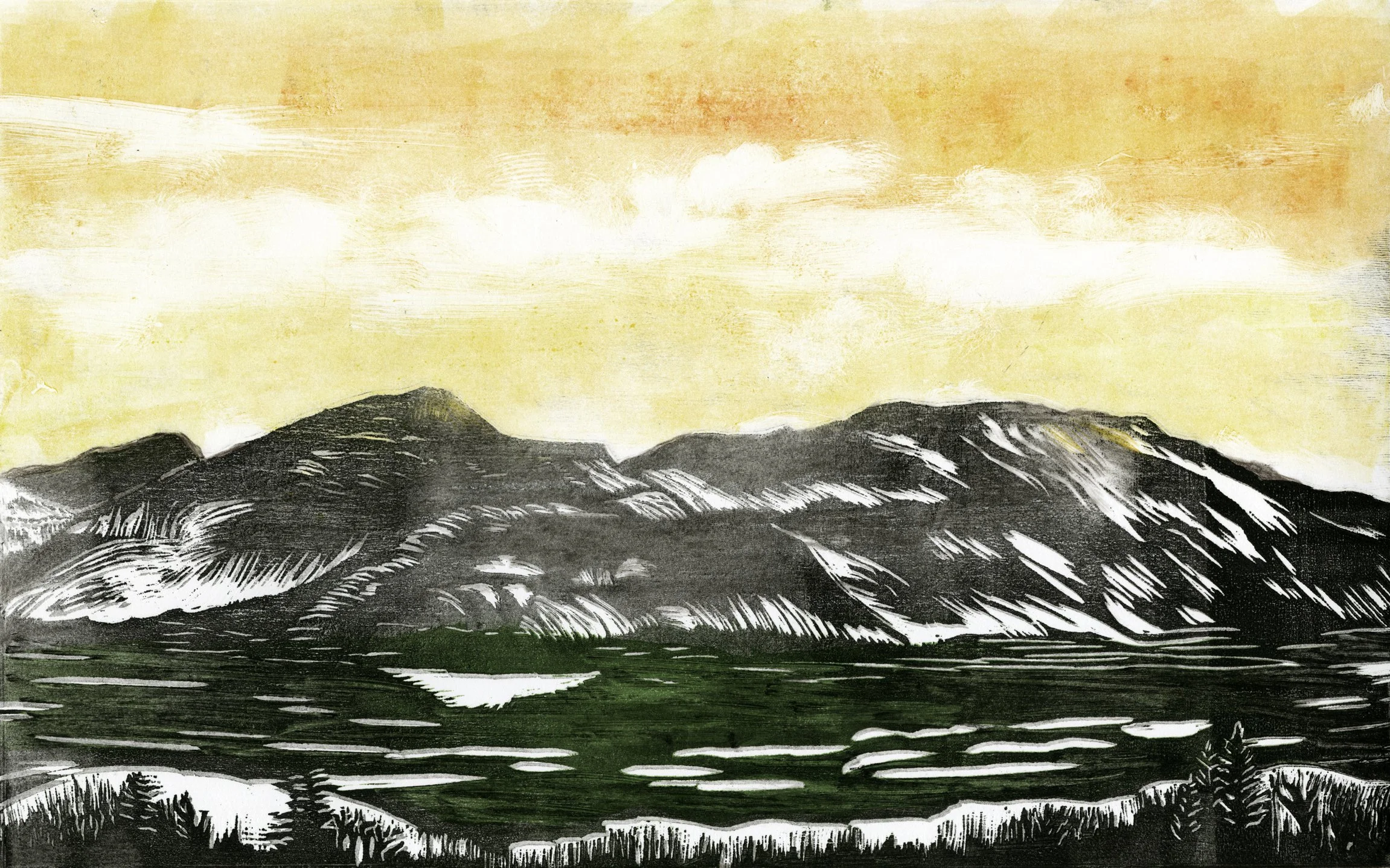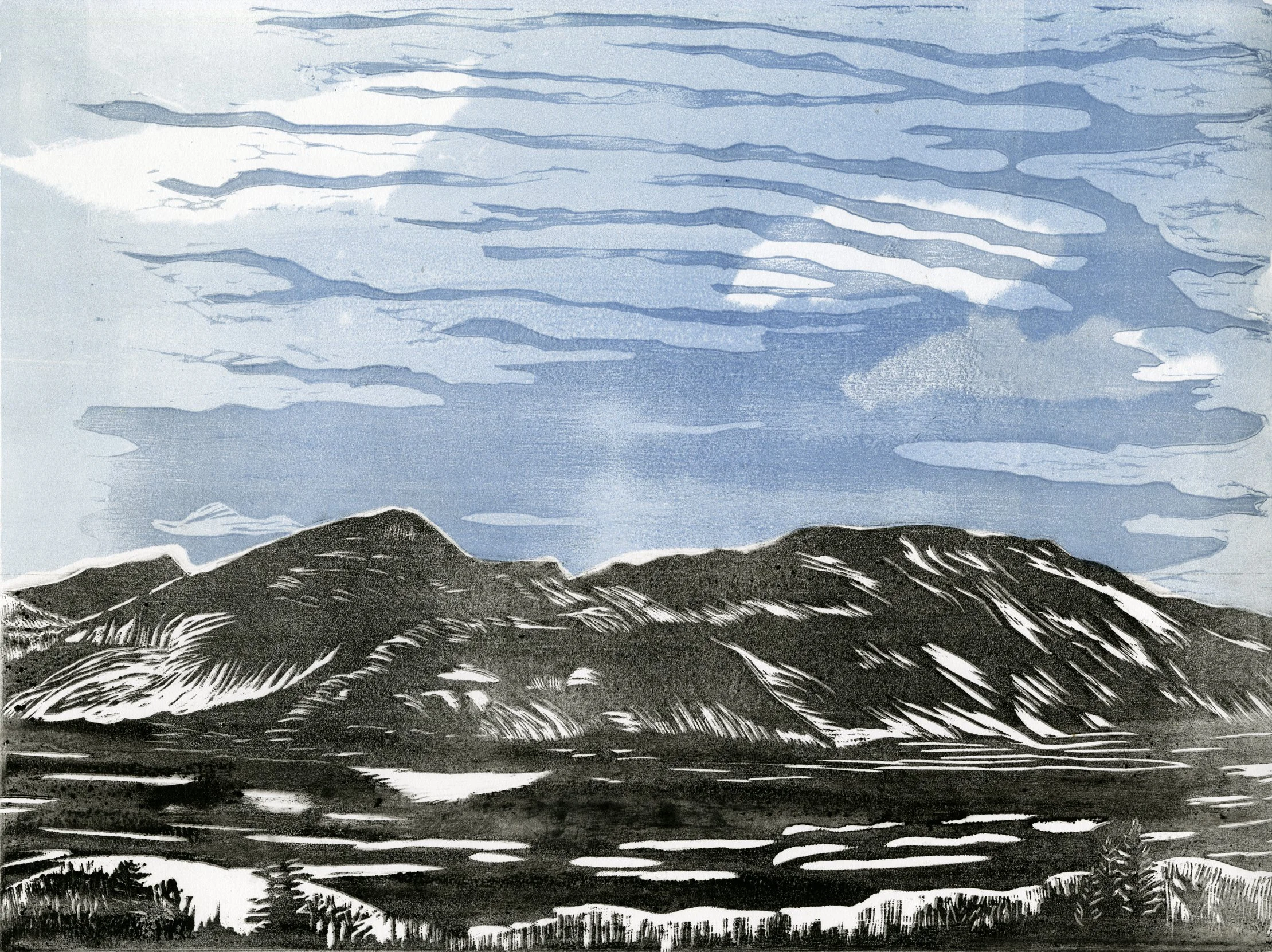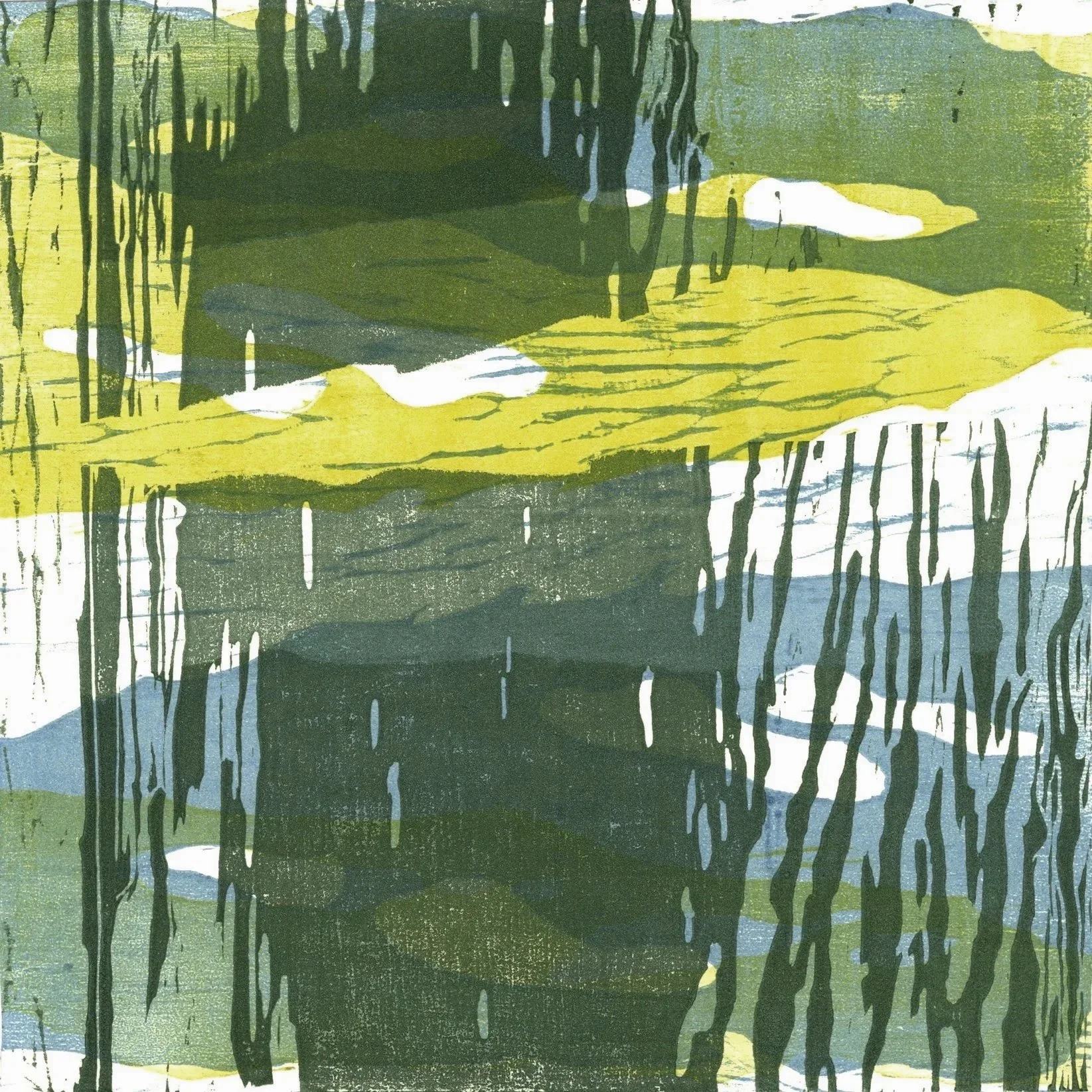 Spring Breakup 1 is a combination woodcut and monotype. It was completed in 2024, and portrays the time in the spring when snow starts melting. It is 10” X 11.25”.