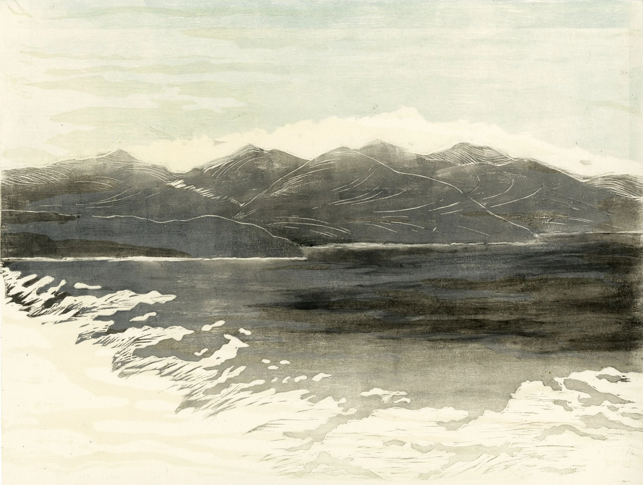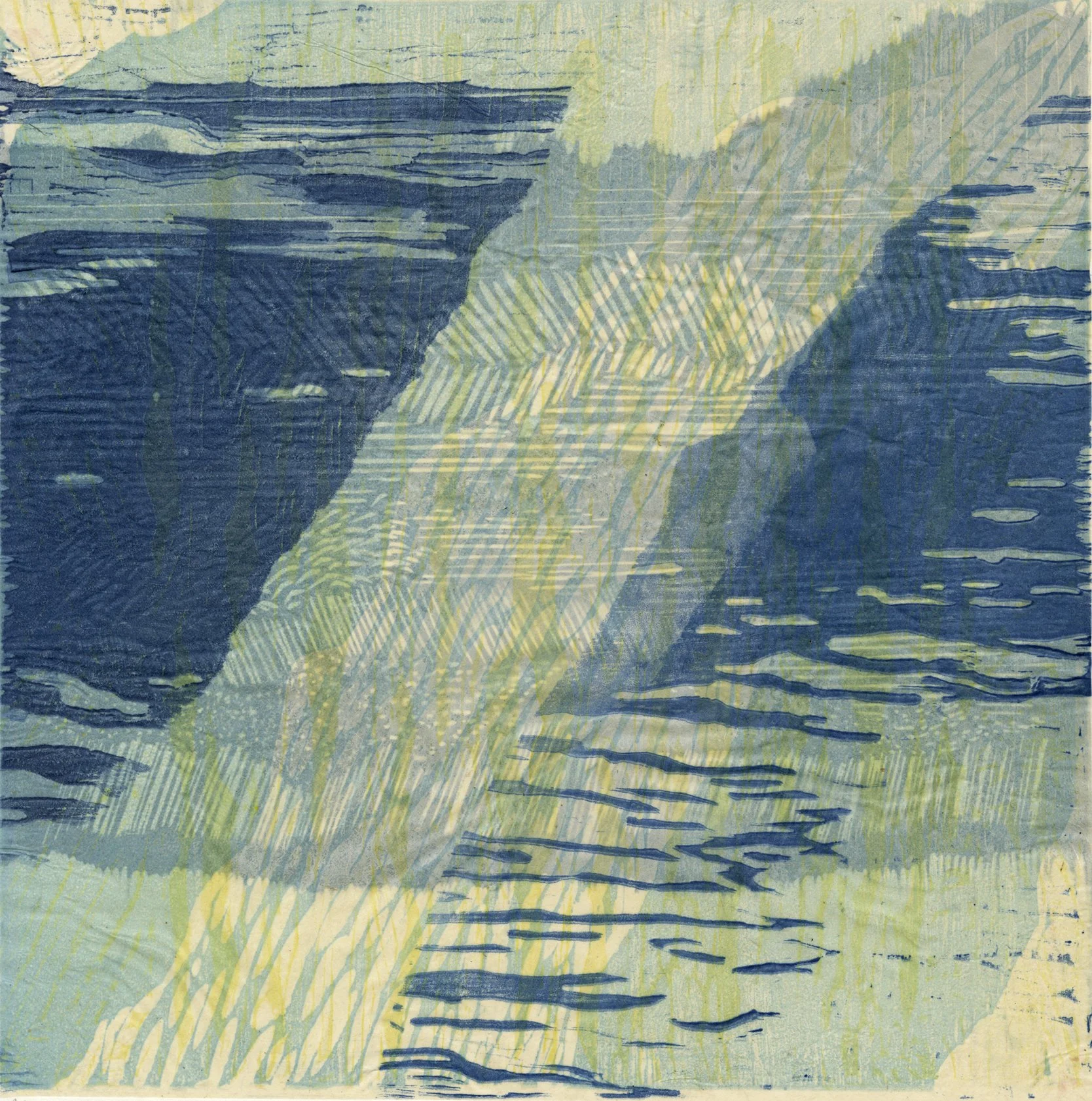 Alaskan Inner Passage is a woodcut and, monotype. It was completed in 2024. It is 12” X 16”